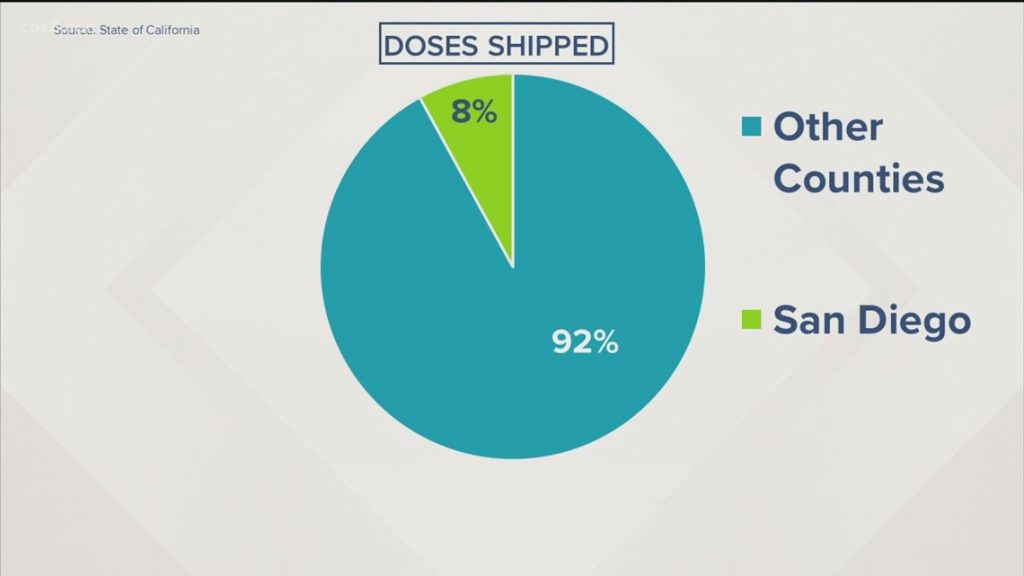 Currently, California allocates vaccines based on a county’s population. Early vaccine distribution data showed San Diego received about 8% of available vaccines, which is proportional to its population. However, data from the county and state indicates San Diego has distributed 11% of all vaccines given in California.