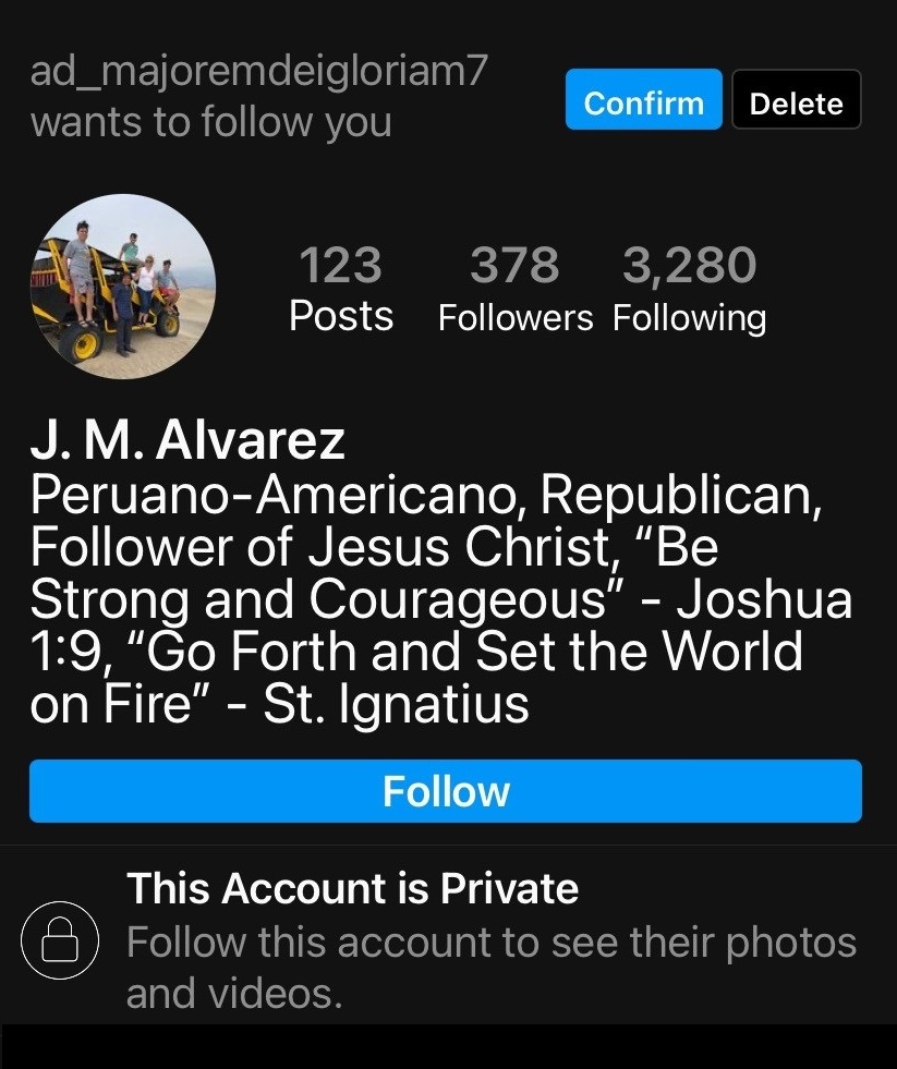 A parent said this screenshot shows Alvarez trying to follow their child, a CCHS student, on social media before the fatal shooting.