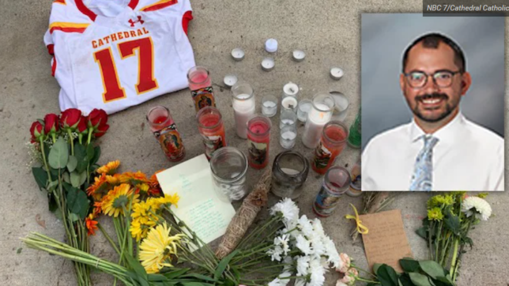 Students, teachers, friends and family gathered in the stands of Manchester Stadium, at Cathedral Catholic High School, still somewhat in disbelief, as they honored the life of their beloved teacher and coach.