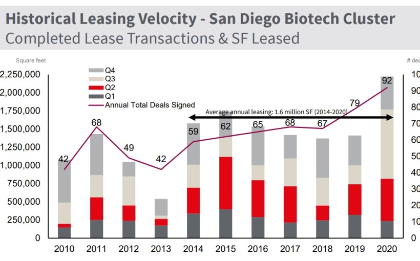 Activated by robust sector investment, the San Diego life sciences market generated record leasing activity during 2020, both in number of completed transactions and square feet leased. A total of 92 lease transactions were signed during 2020, totaling more than 2.2 million square feet. Previously, the highest volume of completed leases in any year was 1.7 million square feet, occurring in 2015. The volume of square feet leased within the San Diego life sciences cluster in 2020 was 50 percent higher than the trailing five-year annual average and 31% greater than the previous record high posted in 2015.