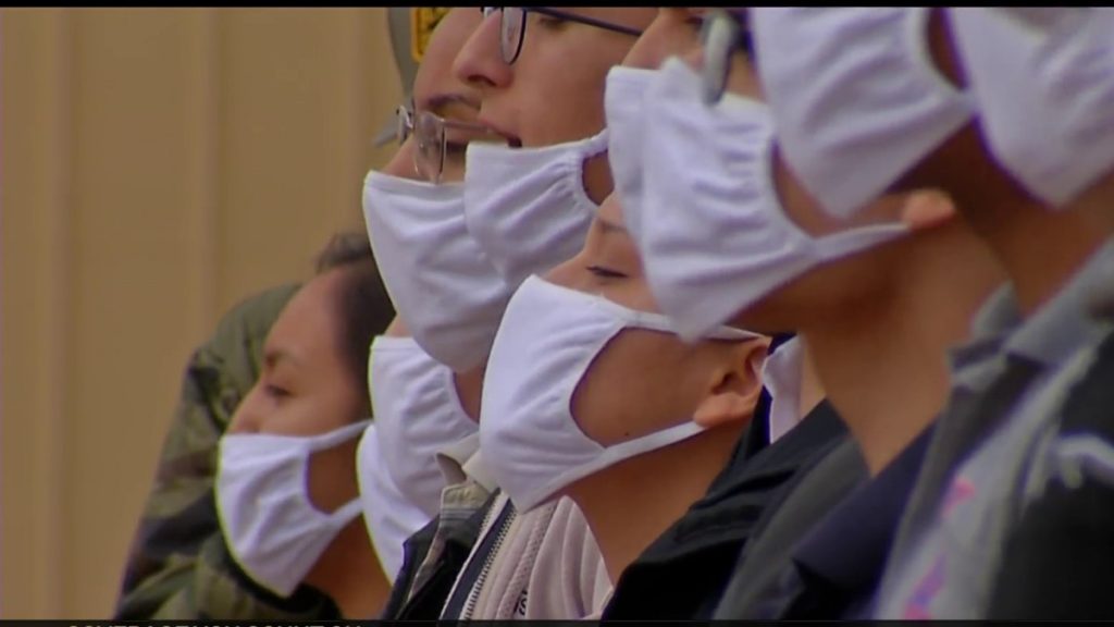 During their training day, drill instructors put the pressure on both male and female recruits in the contraband room. The recruits who have been under quarantine for two weeks because of COVID-19 wore masks and tried frantically to follow commands.