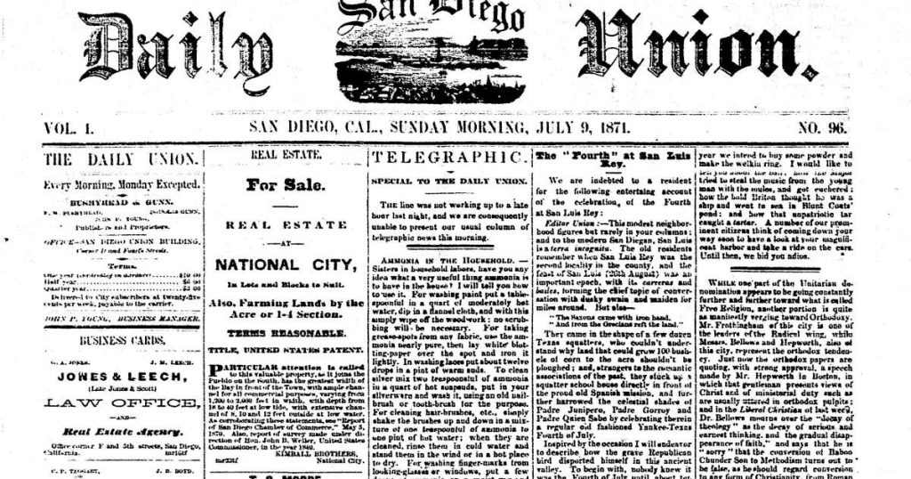From The Daily San Diego Union, Sunday, July 9, 1871: