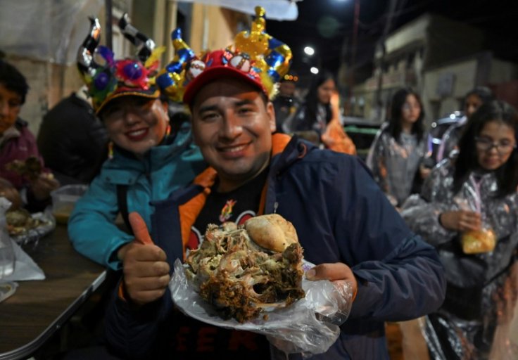 At a table on a street corner in Oruro in western Bolivia, night owls get ready to tuck into a favorite dish touted as a hangover cure: roasted lamb’s head.