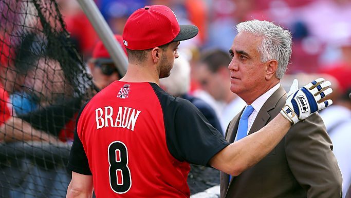 CINCINNATI, OH – JULY 14: National League All-Star Ryan Braun #8 of the Milwaukee Brewers speaks with Pedro Gomez of ESPN prior to the 86th MLB All-Star Game at the Great American Ball Park on July 14, 2015 in Cincinnati, Ohio. (Photo by Elsa/Getty Images)