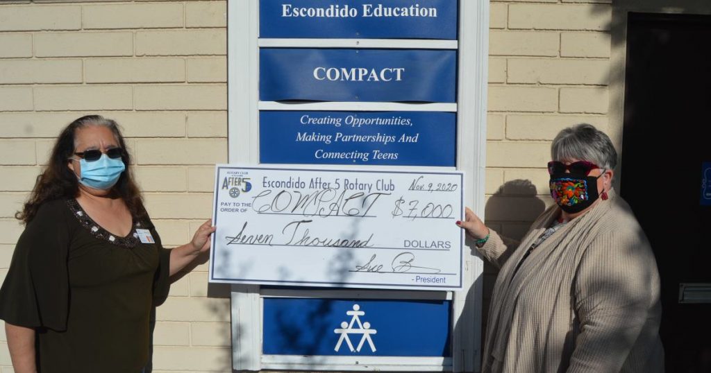 The Rotary Club of Escondido After Five recently presented Patricia Huerta, executive director of Escondido Education COMPACT, with a $7,000 donation to assist the agency with its programs for local youths. The donation was made possible through a matching grant from Rotary District 5340. Rotary of Escondido After Five has made financial contributions through the district matching grant program for the past four years. The club has also participated in programs with COMPACT, including a teen mentoring program. COMPACT offers teens and young adults academic support, health and wellness programs, leadership development, prevention and intervention, as well as workforce development. Learn more at educationcompact.org and facebook.com/RotaryAfter5.