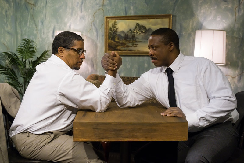 Malcolm X (Rhys Greene) and Dr. Martin Luther King Jr. ( J. Kay Weldon) arm wrestle to decide the way forward during Jeff Stetson's ‘The Meeting’ presented by Point Loma Playhouse. PHOTO BY JOHN HOWARD