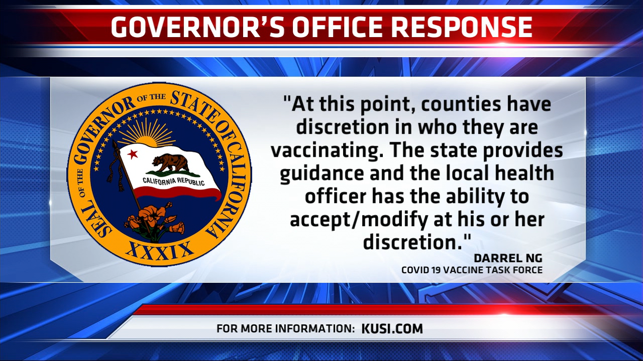 KUSI News was able to reach the Governor’s office to find out whether or not uniformed officers can get the vaccine. Darrel Ng, member of the state’s COVID-19 Task Force, responded explaining, “at this point, counties have the discretion in who they are vaccinating. The state provides guidance and the local health officer has the ability to accept/modify at his or her discretion.”