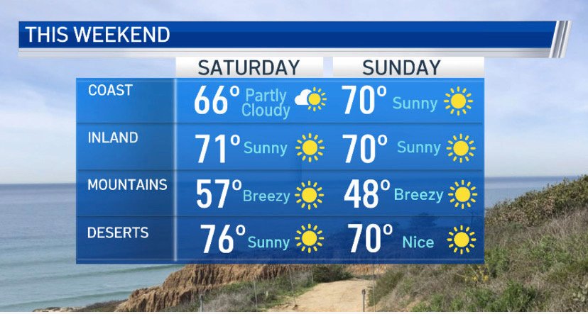 San Diego County was predicted to get breezy on Sunday, forecasters said. A weak high-pressure ridge aloft will follow for Monday with fair, dry and warmer weather ahead of a low-pressure system dropping south well off the coast. The NWS said a storm back east was too far south to bring much rain to Southern California.