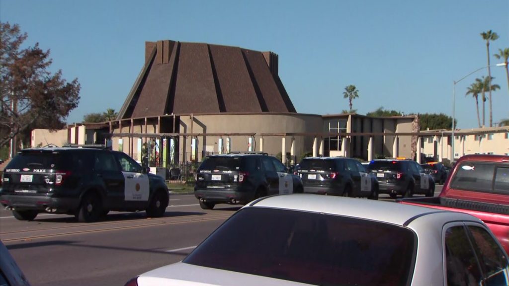 Law-enforcement response to the incident is overwhelming — dozens of police cars are parked up and down the street nearly to nearby Kleefeld Avenue, as well as in the parking lot of the Northminster Presbyterian Church. There is also at least one vehicle from San Diego Fire-Rescue at the scene. as well as an ambulance. Officers have installed police tape in the area, including at the front of the church, across Clairemont Mesa Boulevard and at a nearby O’Reilly Auto Parts store; it’s not known if that was done for crowd control or to preserve evidence at a crime scene.